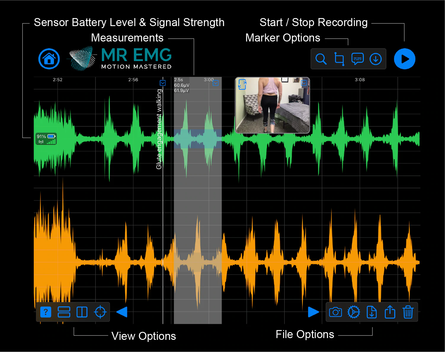 Our iOS app is available from the App Store and works on any iPad or iPhone running iOS 14 or later. It provides all the features you need to record, display and analyse the EMG signals. On the iPhone, you can only use one sensor at a time. On the iPad, you can use up to 4 sensors at once. On the iPhone, you can use up to 2 sensors at once.
