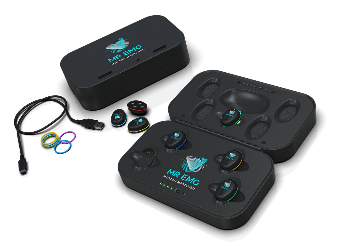 The MR EMG sensors are battery powered, wireless, surface EMG recording devices that use Bluetooth to talk to an iPad. The sensors sample at high speed and use advanced digital filtering to give very high quality data. The battery lasts for more than 12 hours of recording. We sell them in one, two and four sensor kits.